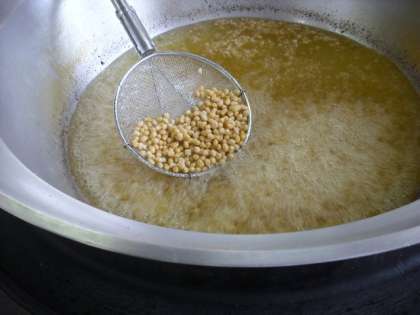じゃこ豆は、大豆とじゃことごまの体によい食材の組み合わせです。給食室では、乾燥大豆を60分間熱湯にひたしてから、でんぷんをまぶして油であげたものと、ゆでたちりめんじゃこと、いったごまと、煮つめた砂糖としょうゆをあわせて作りました。少し手間はかかりますが、いつも人気のご飯によく合うおかずです。