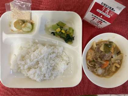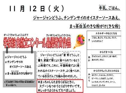 今日の献立は、ジャージャンどうふ、チンゲンサイのオイスターソースあえ、牛乳、ごはん、抹茶白玉のきな粉がけでした。