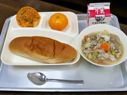 今日の献立は、豚肉と野菜のスープ煮、変わりピザ、みかん、牛乳、黒糖パンでした。