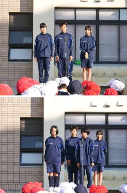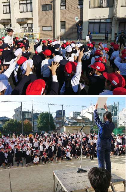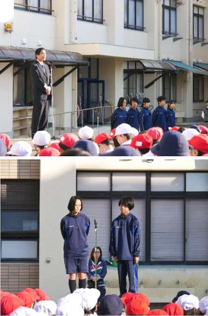 職場体験学習にきた5人の中学生を児童集会で紹介しました。代表の中学生が挨拶してくれました。最後に、児童たちと中学生でジャンケン大会をして楽しみました。