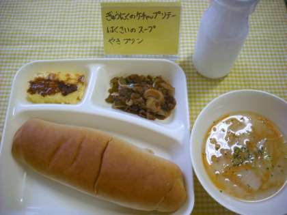 今日の献立は、「牛肉のケチャップソテー、はくさいのスープ、焼きプリン、黒糖パン、牛乳」です。