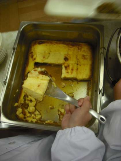焼きプリンは、先に砂糖と水で褐色のカラメルソースを作り、その上に卵、牛乳、クリーム、砂糖をよく混ぜ合わせたものを流し入れて180度で25分間、焼き物機で焼きました。本格的な焼きプリン。給食を返しに来るときにおいしかったと声をかけてくれた人がたくさんいました。