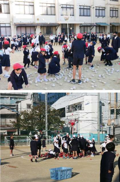 児童会の運動委員会による運動集会がありました。1年生と6年生のペア学年で玉入れを行いました。