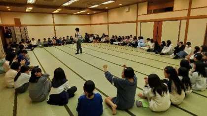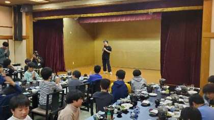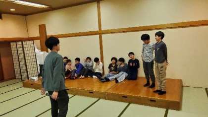 夕食を終えて、お楽しみ会が始まります。レクリエーション係が打ち合わせをしています