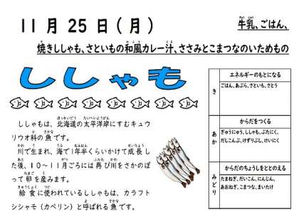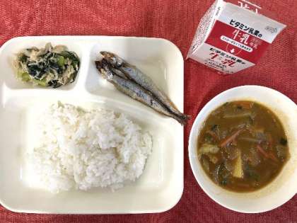 今日の献立は、焼きししゃも、さといもの和風カレー汁、ささみと小松菜の炒め物、牛乳、ごはんでした。