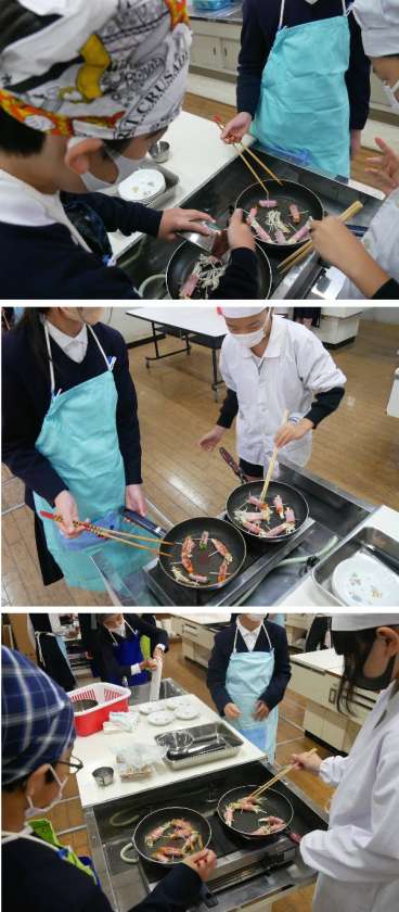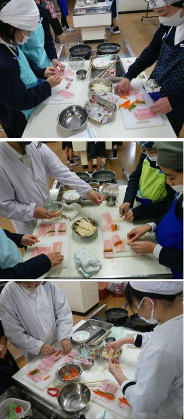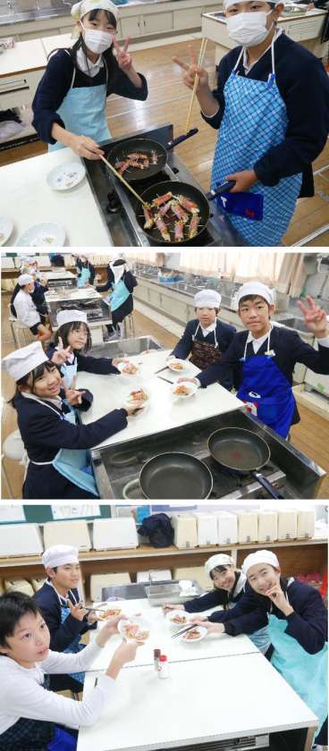 6年生の家庭科では調理実習が家庭科室で行われました。メニューは「野菜のベーコン巻き」です。とてもおいしくできあがりました。