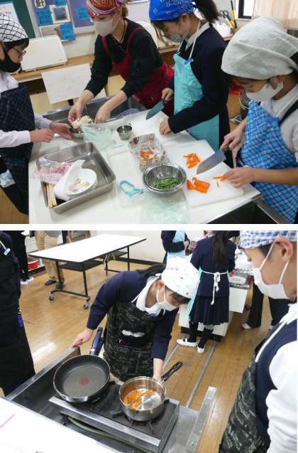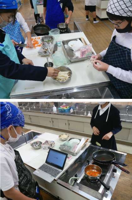 6年生の家庭科では、調理実習で「野菜のベーコン巻き」を作っていました。