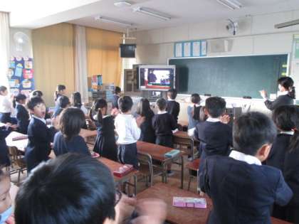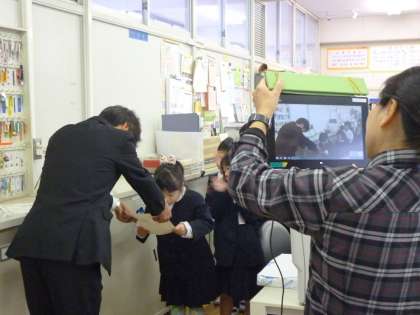 タブレットを使ってLIVE映像による終業式は、いつもと違って、教職員がうまくいくかドキドキしていた式になりました。