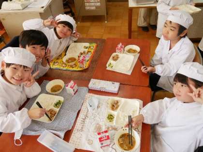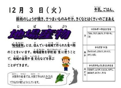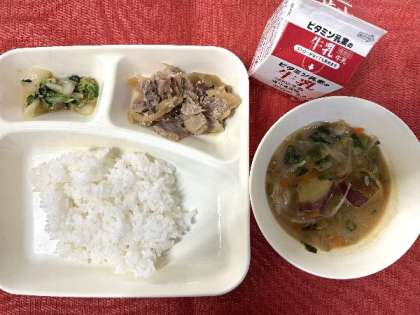 今日の献立は、豚肉のしょうが焼き、さつまいものみそ汁、きくなと白菜のごまあえ、牛乳、ごはんでした。