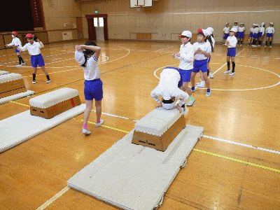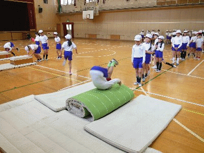 3年生がとび箱で前転の練習を、段階的に練習しています。