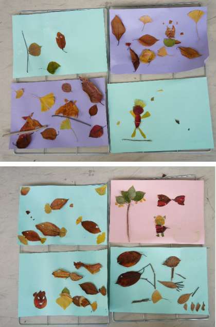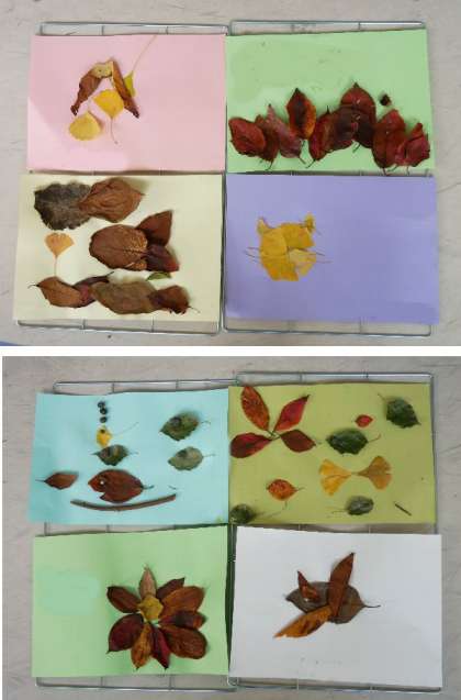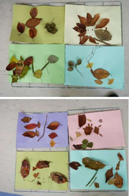 1年生では、秋さがしでひろってきた落ち葉で作品づくりをしました。