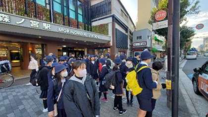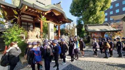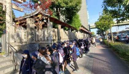 JR森ノ宮駅に到着しました。まず、森ノ宮神社にたちより戦争痕跡を見学しました