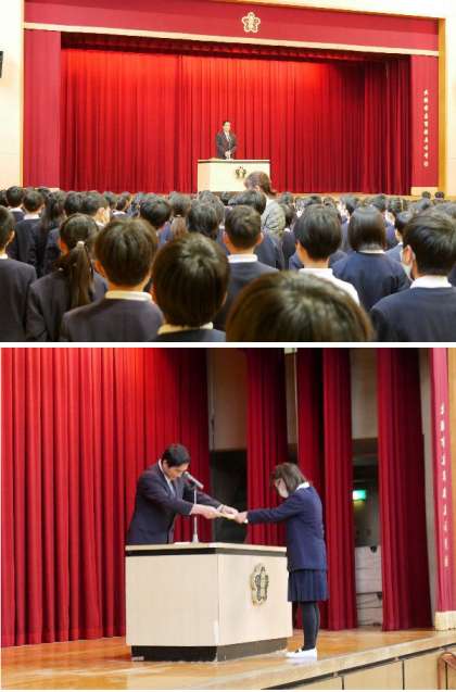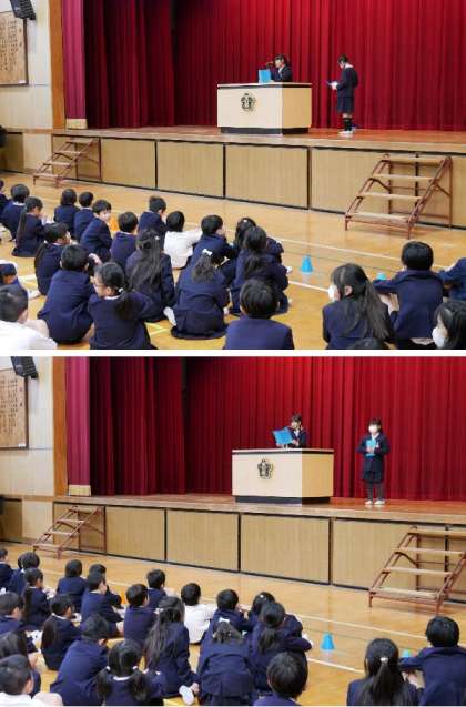 5限目に2学期終業式を行いました。6年生に租税教育推進の表彰をおわたししました。3年生の代表児童2名が、2学期をふりかえってがんばった事や3学期にむけた抱負を言ってくれました。諸注意のあと、最後に全児童で校歌を歌いました。