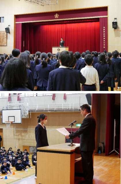 3学期のはじめの始業式を講堂で行いました。最初に大阪府給食献立コンクールの最優秀賞の賞状をお渡しいたしました。