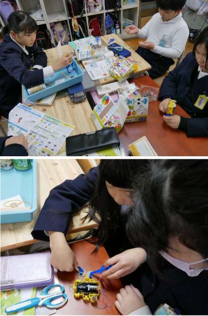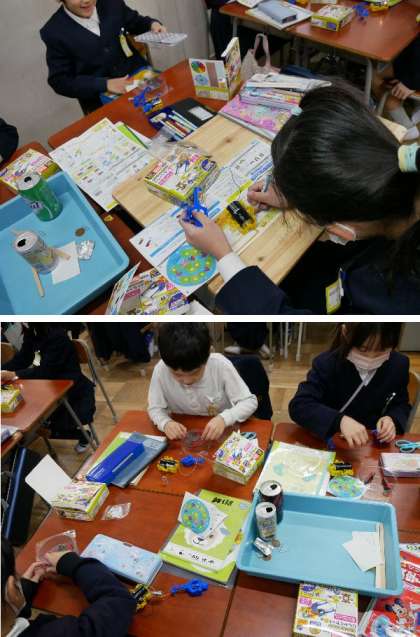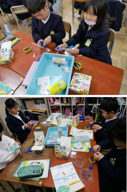 3年生の理科では、電気について学習しています。組立キットを使って、電池であかりをつけたりします。10円玉や1円玉が電気を通すのかもテストしていました。