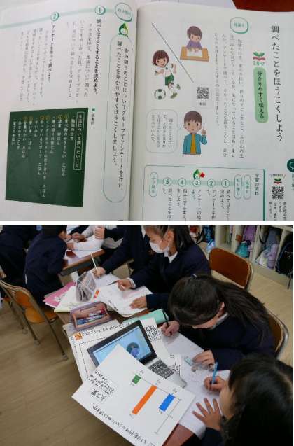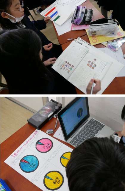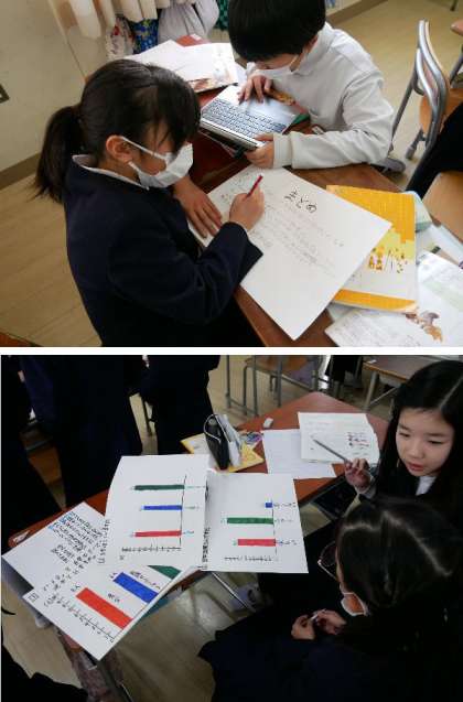 4年生では、クラスでアンケートをとって集計したり、調べたことを整理して報告します。データを見やすくしたりしてがんばっています。