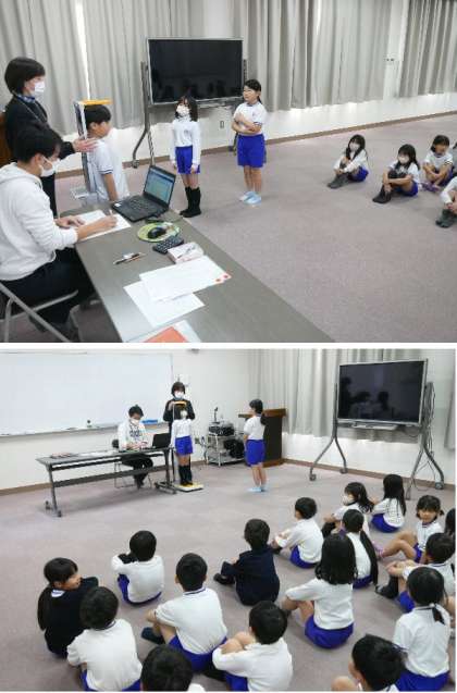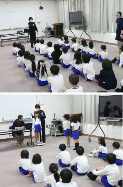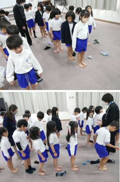 今日から、順番に発育測定が行われます。今日は1年生です。入学からだいぶ成長しましたね。保健室の先生が足指の運動練習を教えてもらいました。