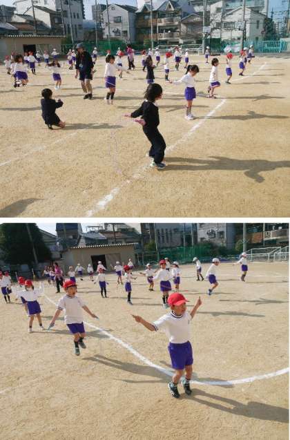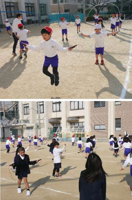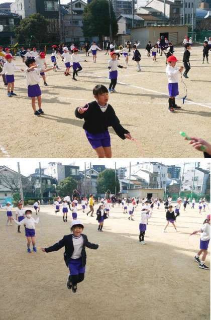 今日からなわとび週間がはじまりました。20分休みに運動場でなわとびの練習をします。いろんな跳び方でがんばっています。
