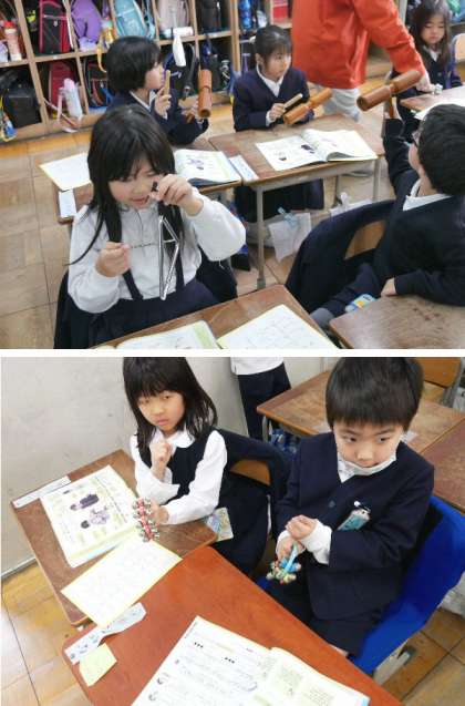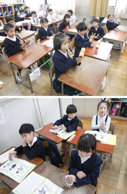1年生が、トライアングル、すず、ウッドブロックなどの楽器でいろいろな音をならしていました。