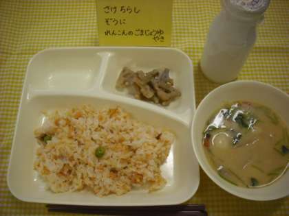 1月8日(金)の給食は、正月の行事献立で「さけちらし、ぞうに、れんこんのごまじょうゆ焼き、牛乳」です。さけちらしは、紅鮭フレークやたけのこなどが入った色鮮やかなちらしずしです。 ぞうには、白みそをたっぷり使った関西風の味つけです。1年に1回だけ登場するなにわの伝統野菜の金時にんじんは、地産地消の取り組みで今日は大阪市の畑で収穫されたものが届けられました。「ぞうには、なぜぞうにというのかな?」のクイズの正解は、いろいろな食べ物を煮ているからでした。(ゾウの肉が入っているから に手をあげている人はいなかったようです。)