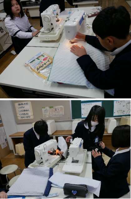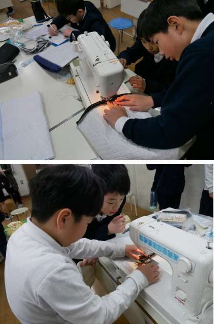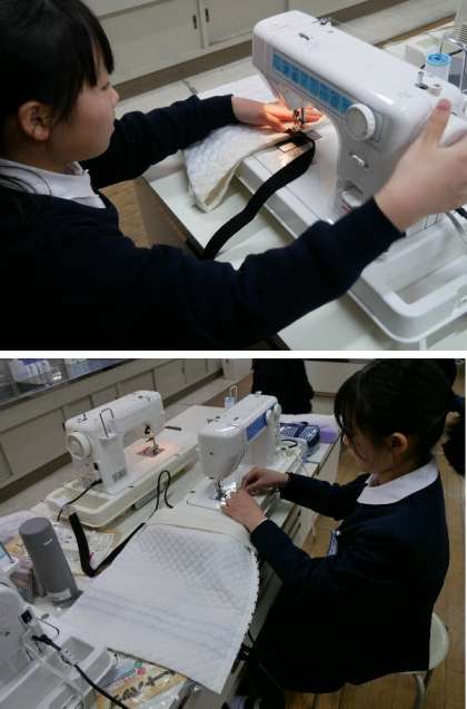 5年生がナップザック袋を作っています。ミシンで仕上げていきます。