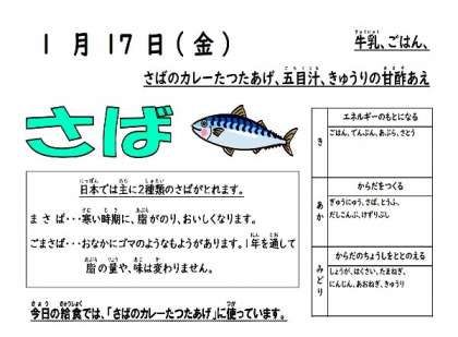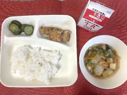 今日の献立は、さばのカレーたつたあげ、五目汁、きゅうりの甘酢あえ、牛乳、ごはんでした。