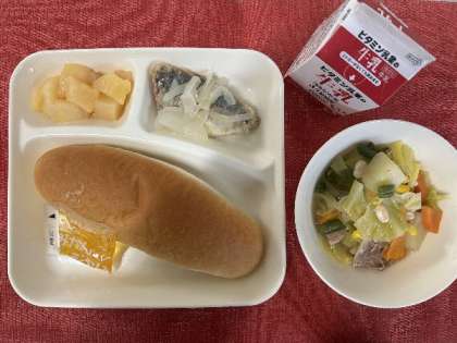 今日の献立は、あじのレモンマリネ、でぼ豆のスープ煮、白桃(缶詰)、みかんジャム、牛乳、コッペパンでした。