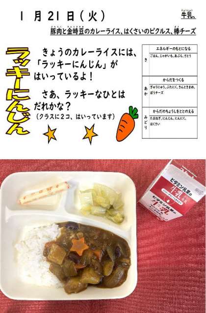 今日の献立は、豚肉と金時豆のカレーライス、白菜のピクルス、棒チーズ、牛乳でした。