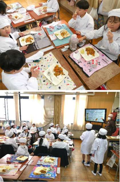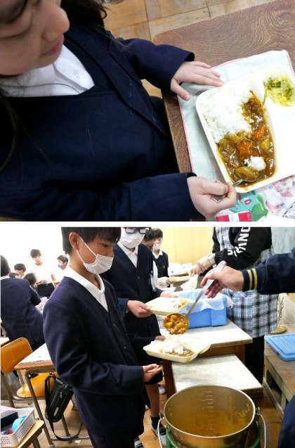 今日のカレーライスには、ラッキーにんじんが入っています。各学級に2枚なので、あたった人はラッキーですね。みんな大好きカレーライス、おかわりに列ができます。