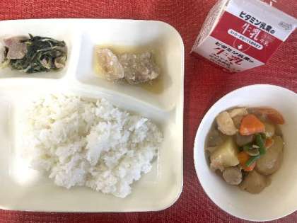 今日の献立は、鶏肉のおろしじょうゆかけ、一口がんもとじゃがいものみそ煮、みずなの煮びたし、牛乳、ごはんでした。