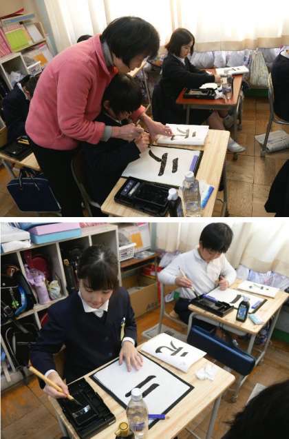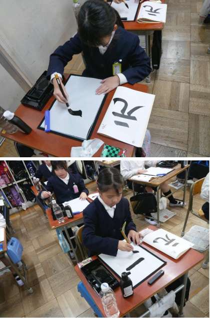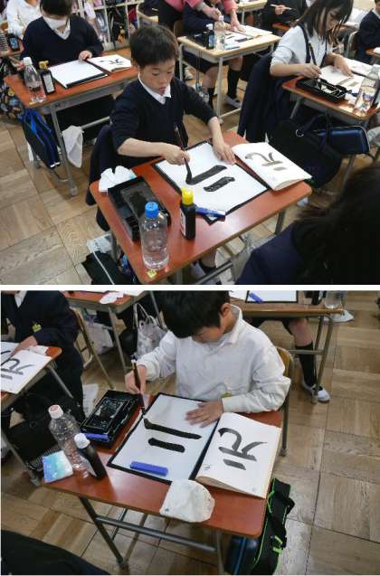 3年生が、元気の「元」を書道でかいています。結構むずかしいですね。