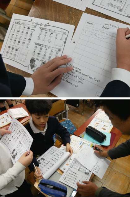 5年生の英語では、「好きなメニューは何か」「いくらするのか」などを、お互いに聞き合いして、答えて、書いたりして、楽しく学習を進めています。