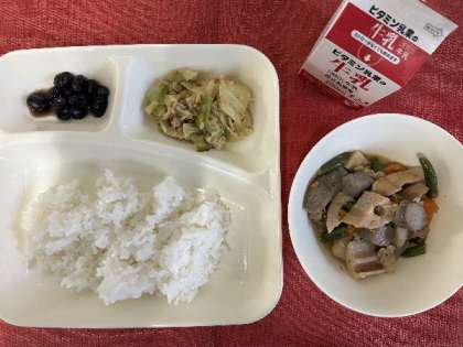 今日の献立は、筑前煮、ツナとキャベツのごまいため、黒豆の煮もの、牛乳、ごはんでした。