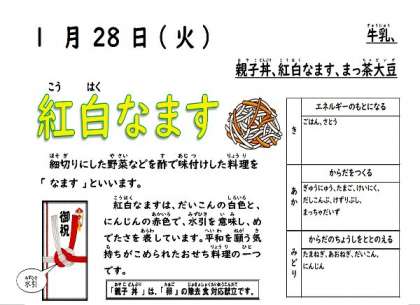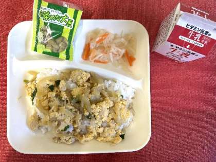 今日の献立は、親子丼、紅白なます、抹茶大豆、牛乳でした。