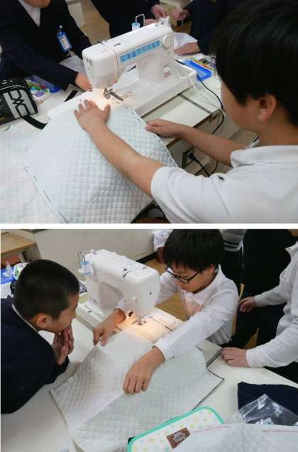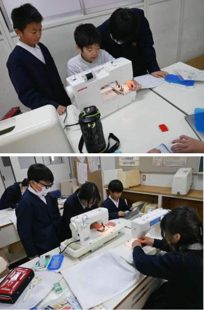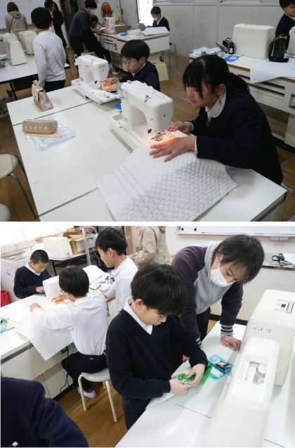 5年生が家庭科室でミシンをかけています。キルティングでトートバックを作っています。