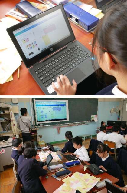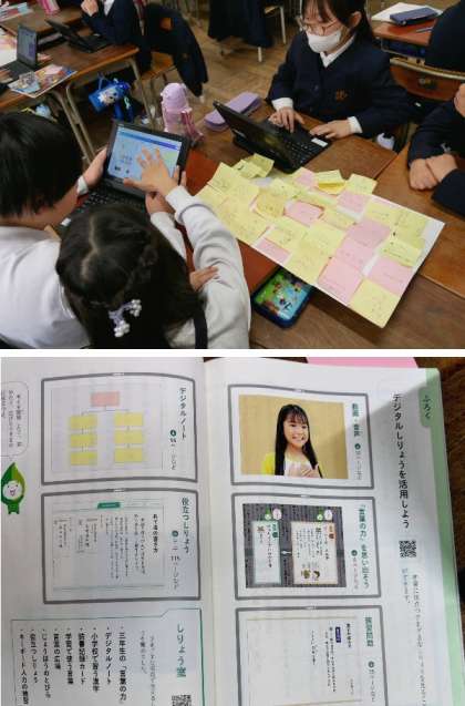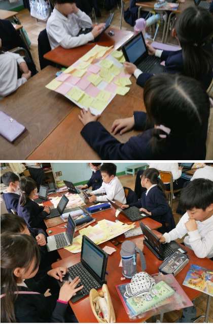 3年生の国語では、クラスの思い出づくりのための意見を出し合ってまとめています。パソコンで考えや理由を分かりやすいようにするために、パソコンを使っていました。