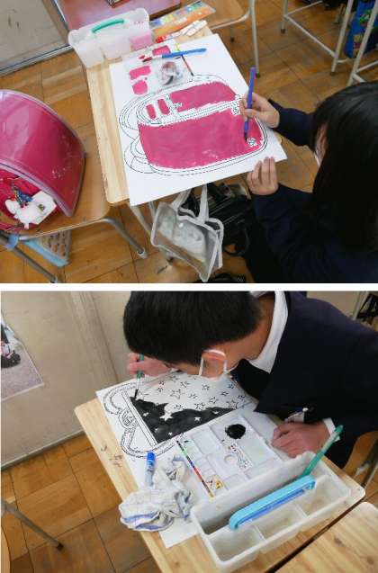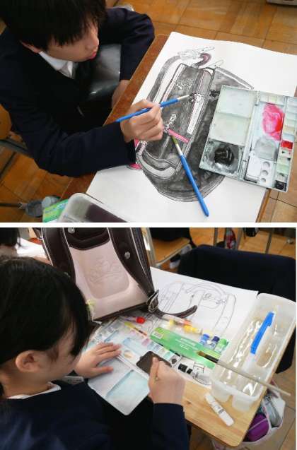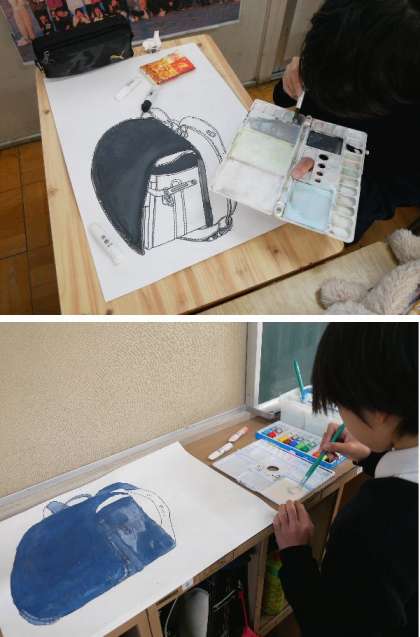 6年生がランドセルを丁寧に描いています。6年間使ってきたランドセルに感謝の気持ちで描いています。