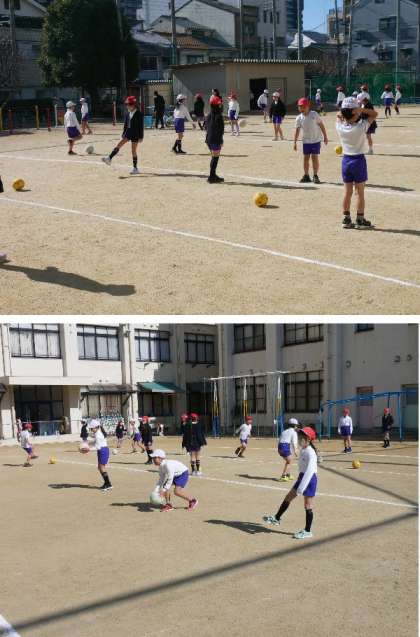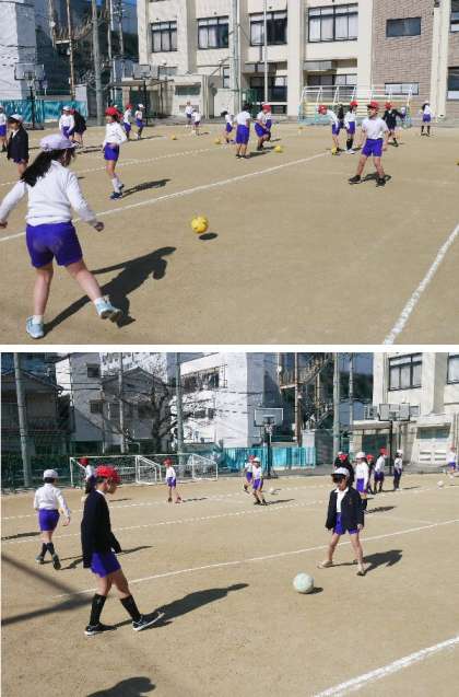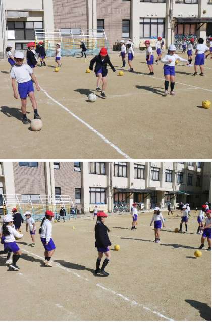 3年生が運動場でサッカーボールの練習をしています。最近は朝夕の寒さがきびしいですが、日当たりのよい昼間は暖かく感じます。