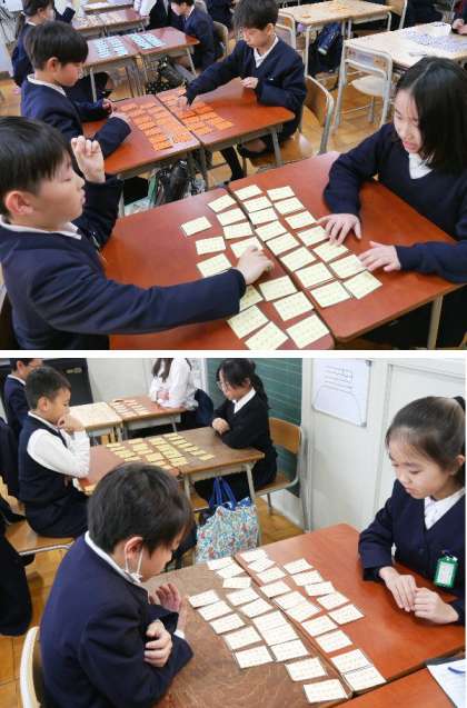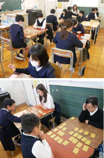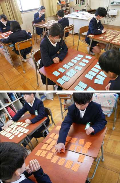 4年生では、百人一首を学習しています。1対1で百人一首の対戦をしています。だいぶ、句を覚えている子もいるようです。