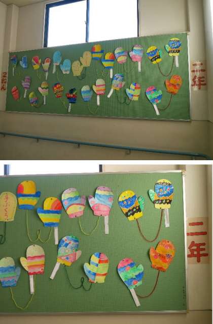 2年生の掲示版に、おしゃれなてぶくろが掲示されました。