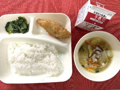 今日の献立は、たらフライ、うすくず汁、こなつなのごまあえ、牛乳、ごはんでした。