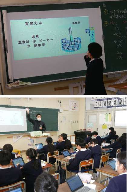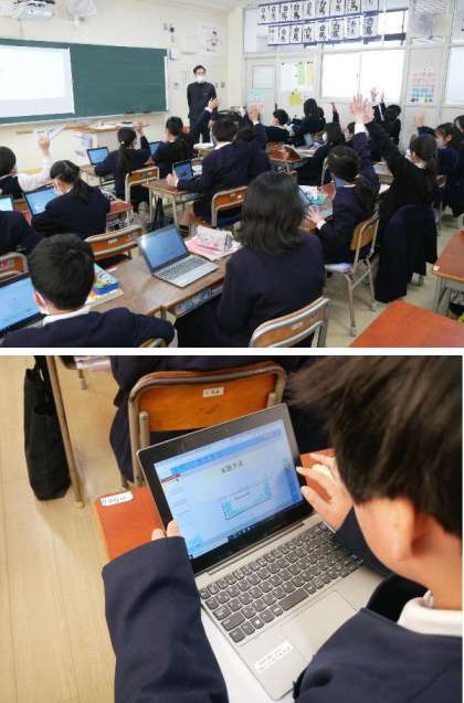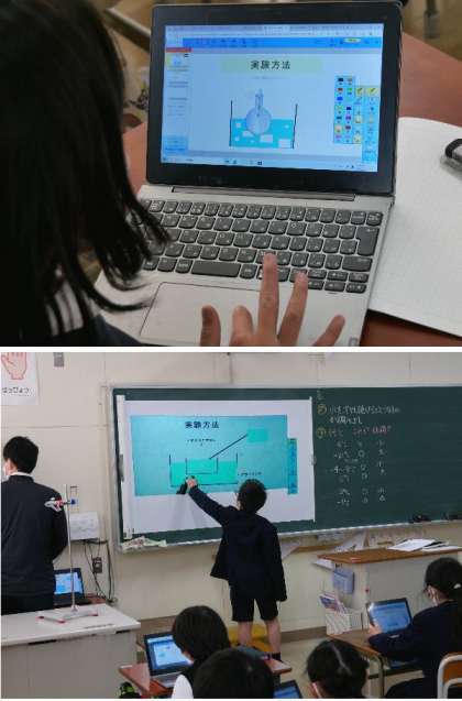 4年生の理科では、ICTをフル活用して、振り返り問題をしたり、みとおしをたてたりして、データを全体で共有したりして学習していました。