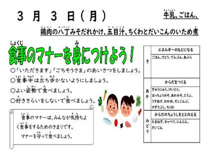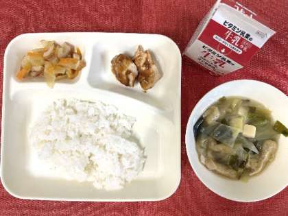 今日の献立は、鶏肉の八丁みそだれかけ、五目汁、ちしわとだいこんのいため煮、牛乳、ごはんでした。