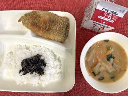 今日の献立は、いわしのフライ、みそ汁、牛ひじきそぼろ、牛乳、ごはんでした。