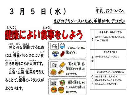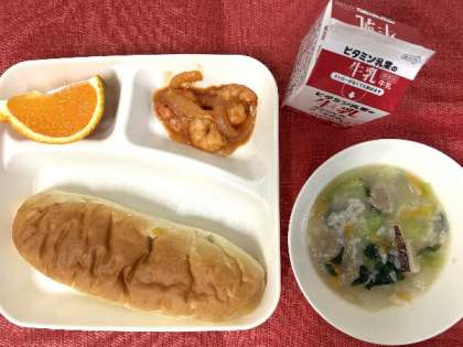 今日の献立は、えびのチリソースいため、中華がゆ、デコポン、牛乳、おさつパンでした。