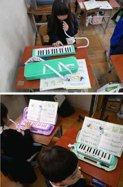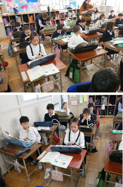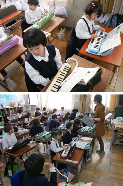 1年生では、「こいぬのマーチ」を鍵盤ハーモニカで、聞き合いながら演奏します。順番に演奏して、みんなで聞き合います。