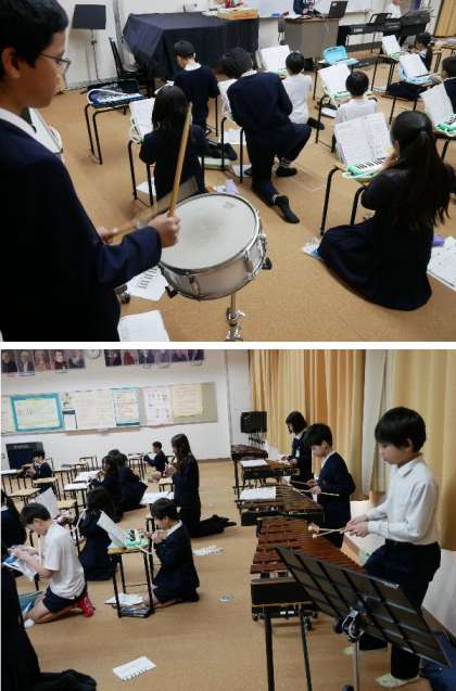 4年生が音楽室で、楽器ごとにパートに分かれて合奏演奏をしていました。曲は「ラ クンパルシータ」です。