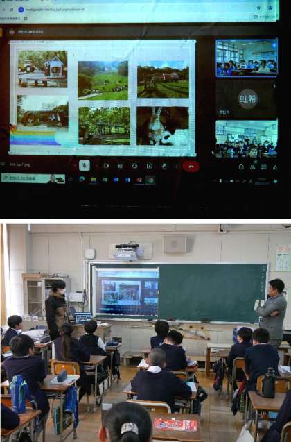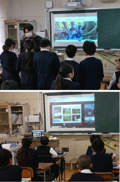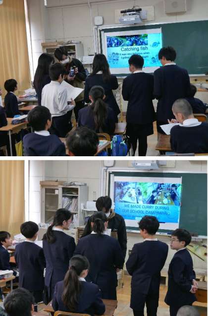 5年生の英語では、台湾の小学校とオンラインで接続して、お互いの学校のことについて交流しました。林間学習について班で説明をしていました。