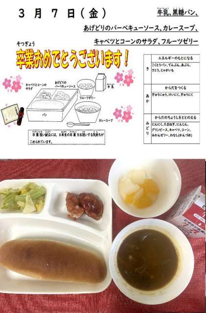 今日の献立は、あげどりのバーベキューソース、カレースープ、キャベツとコーンのサラダ、フルーツゼリーでした。子ども達が大好きなメニューでした。