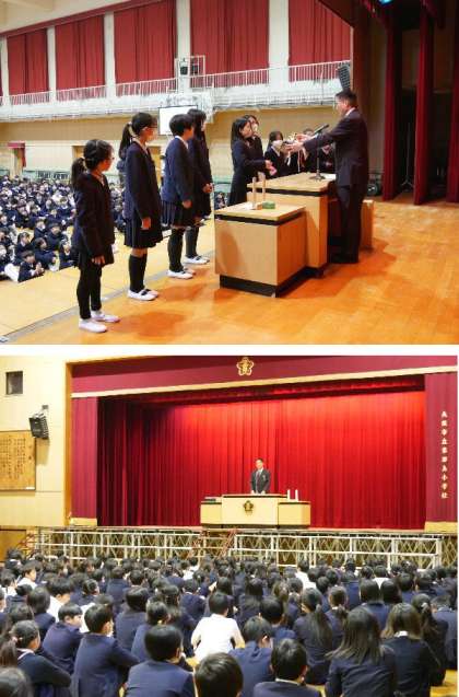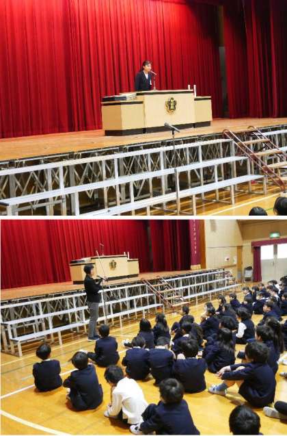 全校朝会でミニバスット女子の表彰をおこないました。校長先生から、明日で14年目となる東日本大震災についてお話しました。